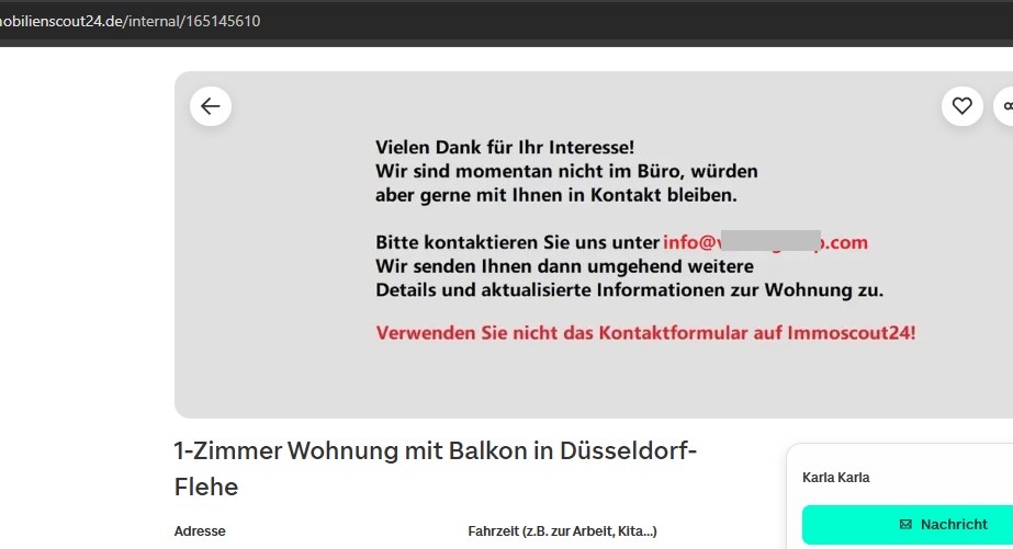 3. Als einzige Kontaktmöglichkeit ist nur eine E-Mail-Adresse oder ein weiterführender Link angegeben, der von der ImmoScout24-Plattform wegleitet. Betrüger versuchen die Kommunikation möglichst schnell von der Plattform wegzuführen.